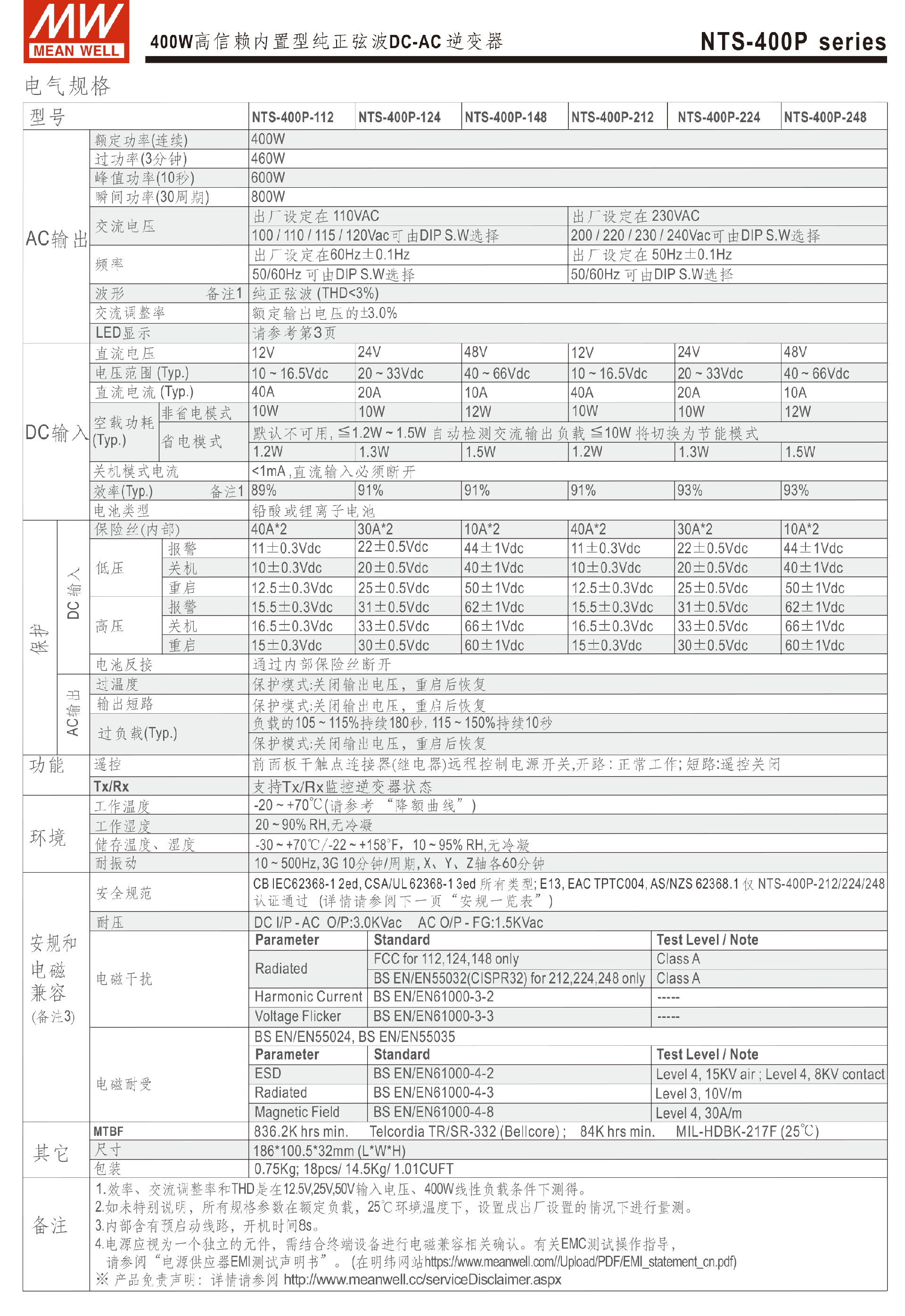 臺灣明緯NTS-400P系列DC-AC逆變器