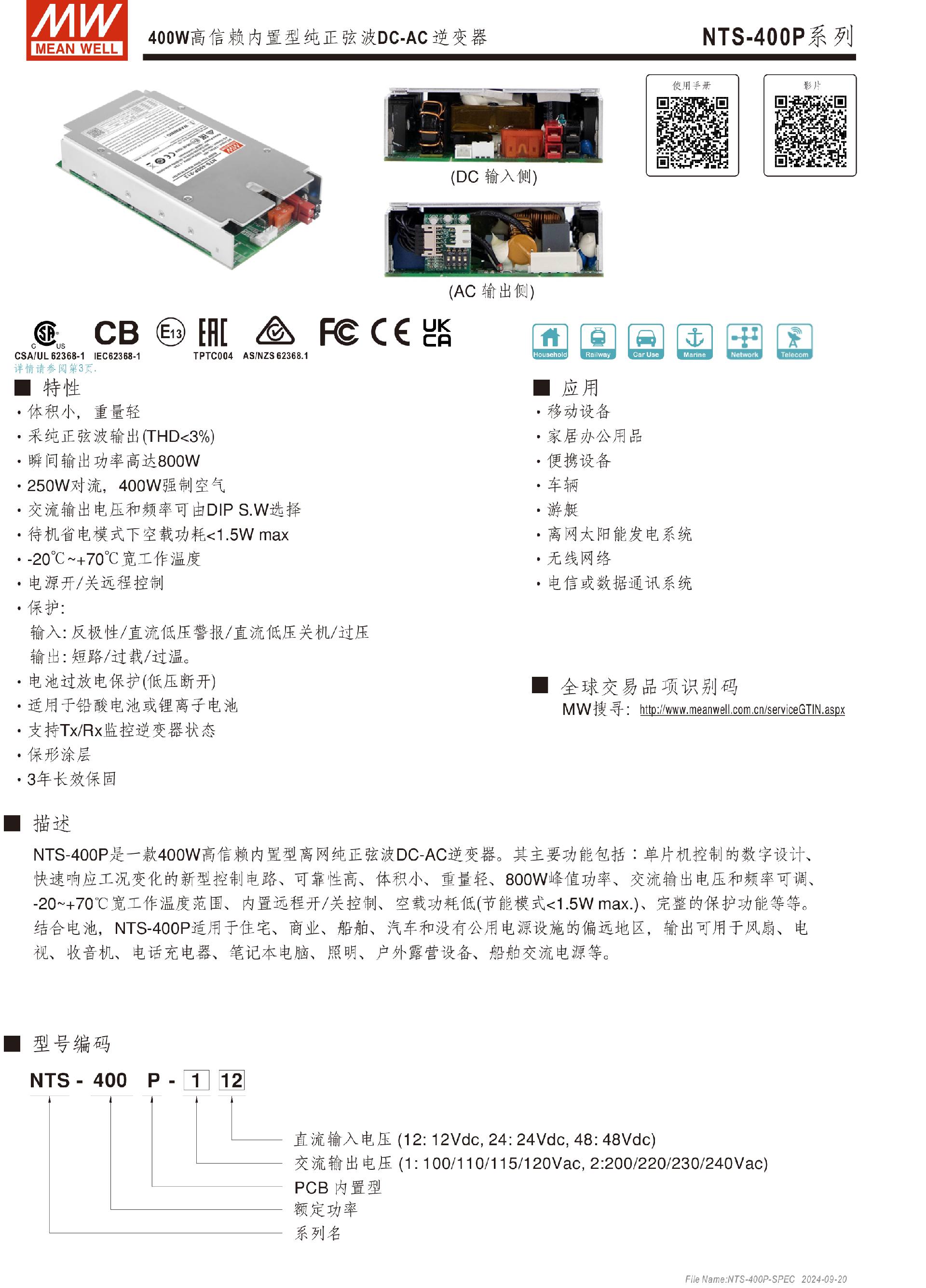 臺灣明緯NTS-400P系列DC-AC逆變器-NTS 系列 (置入型)-東莞市誠緯實業(yè)有限公司-