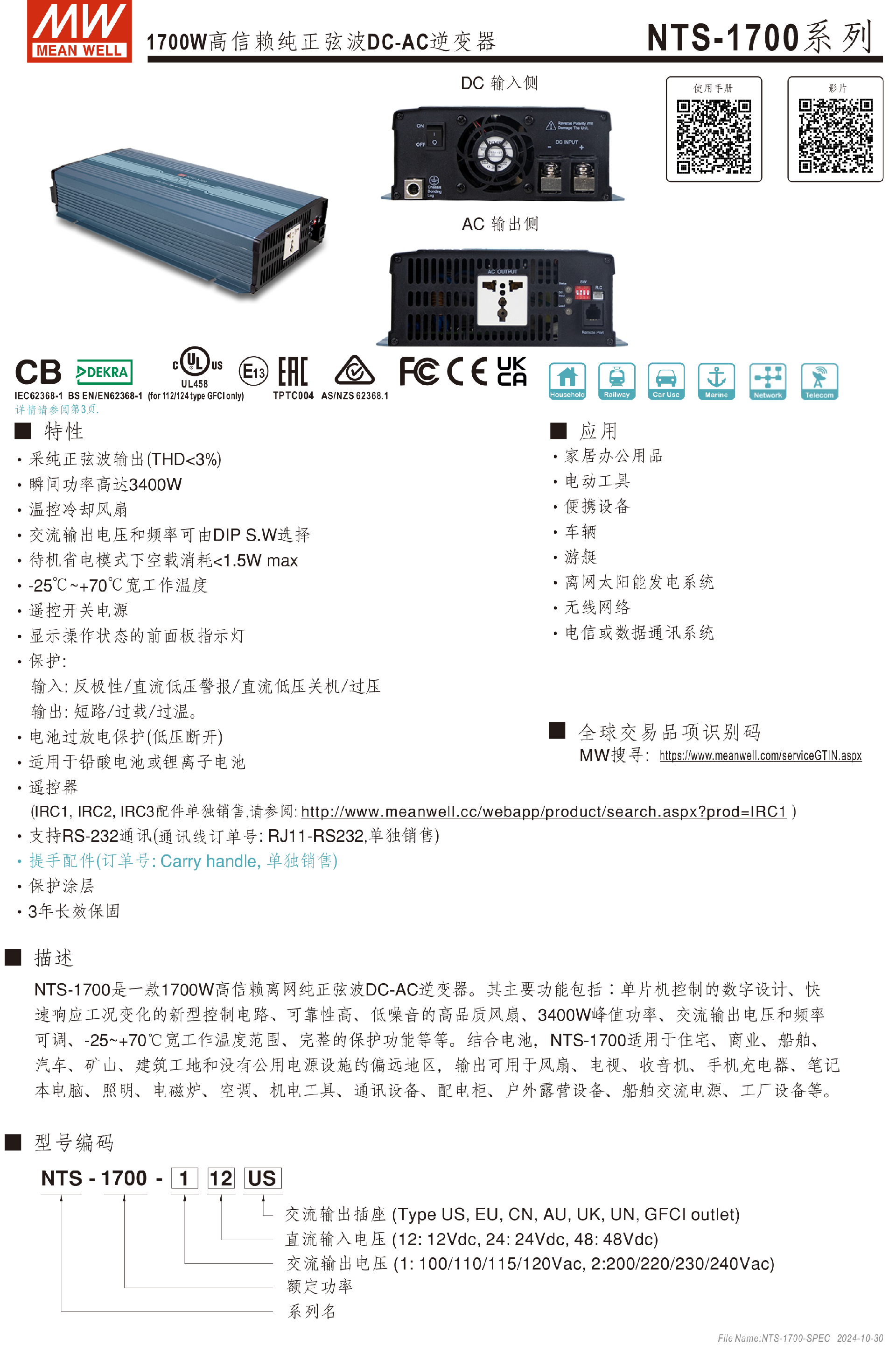臺(tái)灣明緯NTS-1200系列DC-AC逆變器