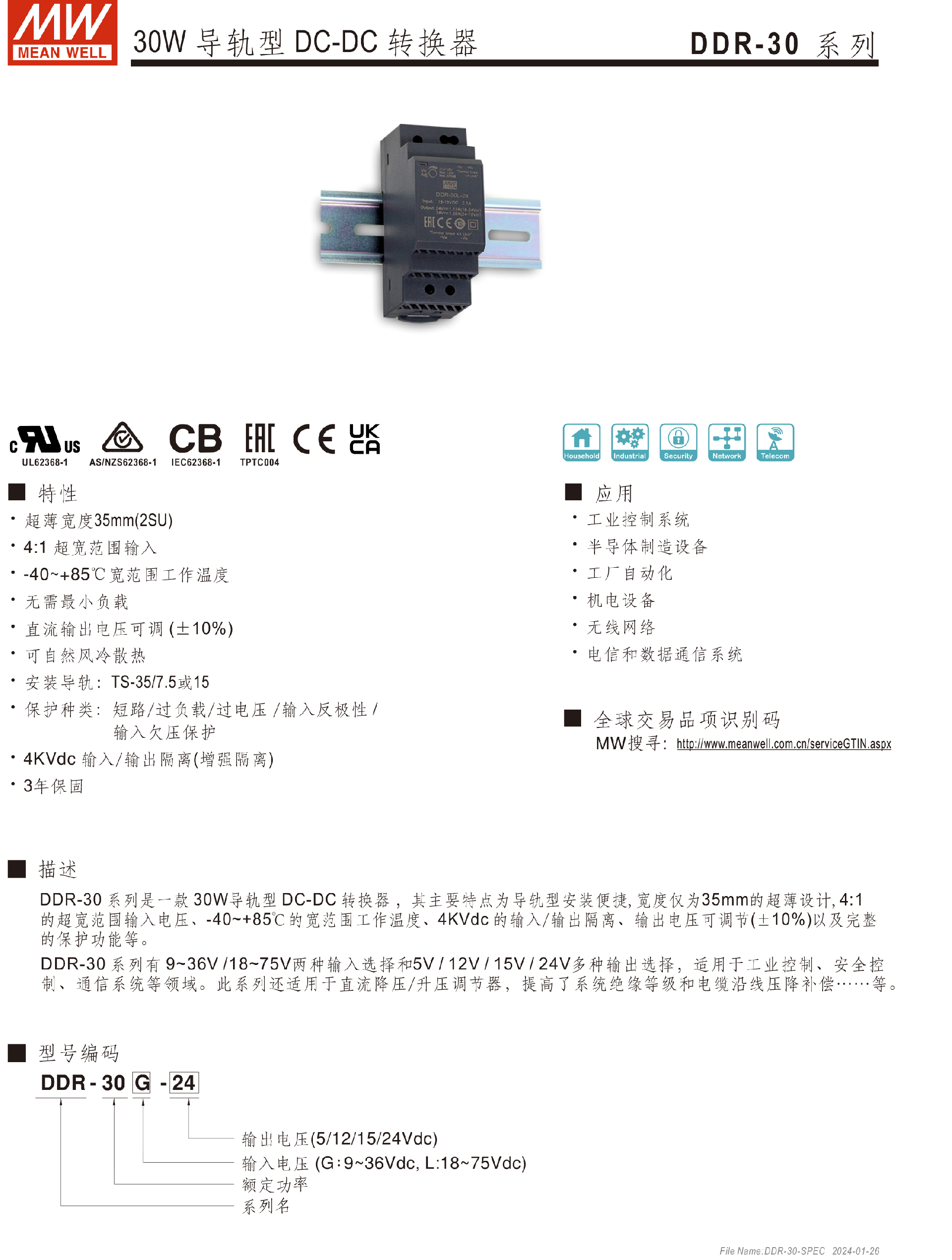 明緯電源DDR-60系列60W導(dǎo)軌型DC-DC轉(zhuǎn)換器