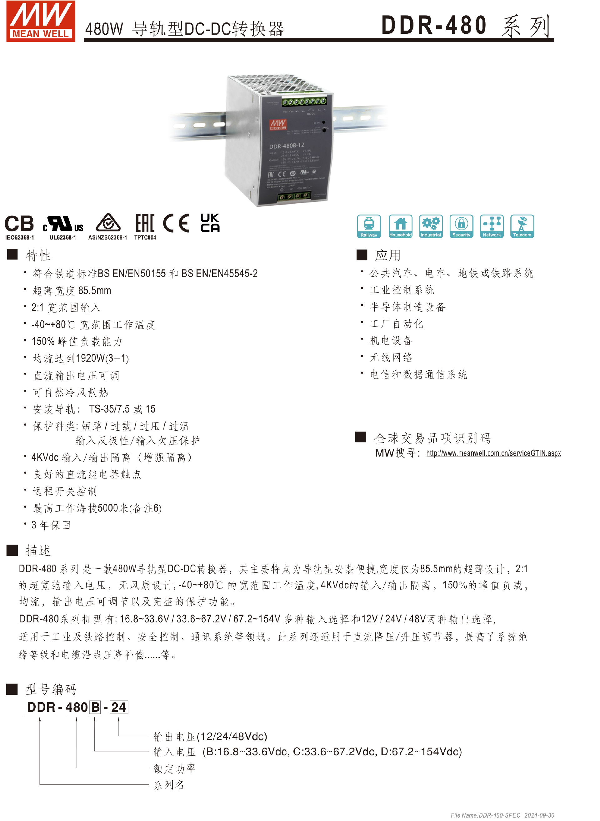 明緯電源DDR-240系列240W導(dǎo)軌型DC-DC轉(zhuǎn)換器