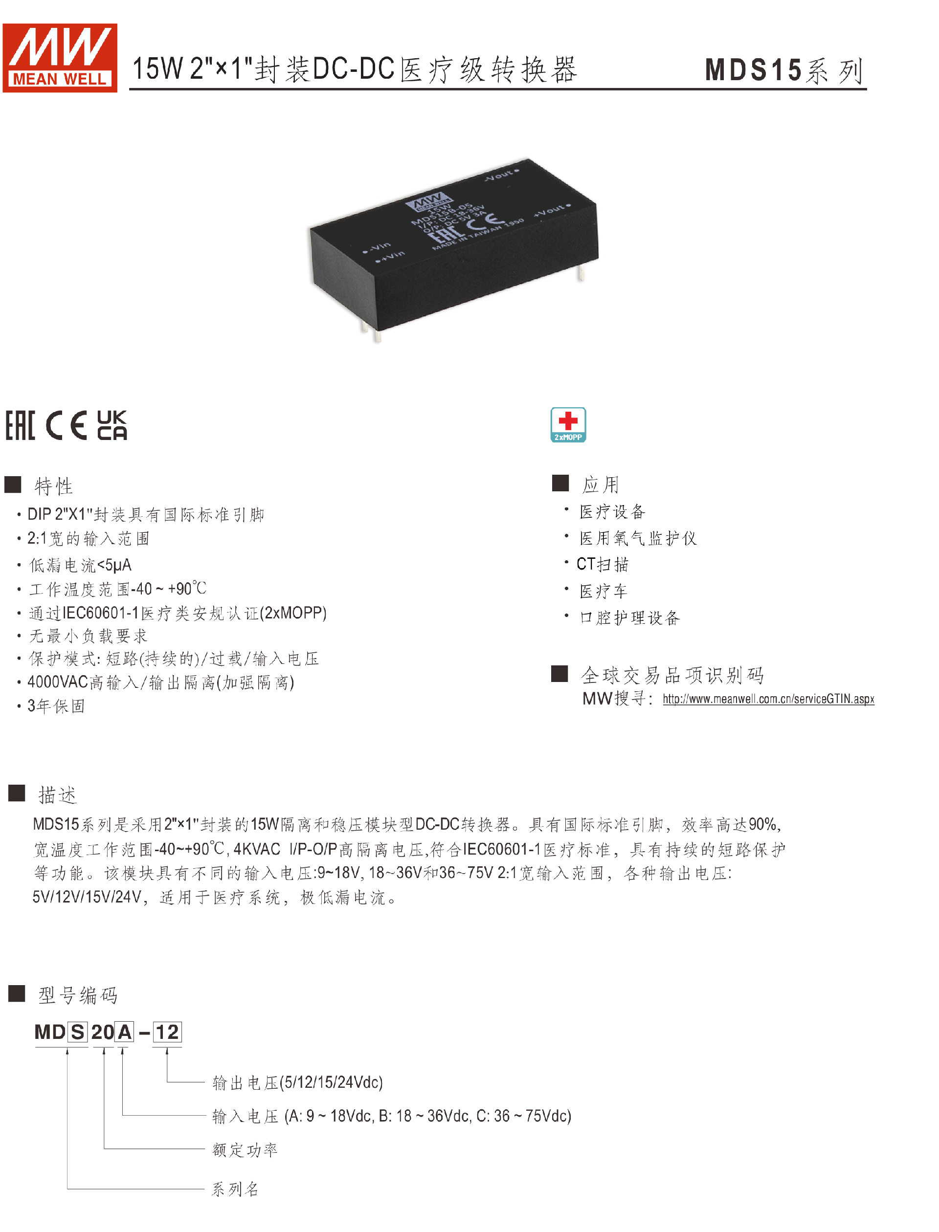 明緯電源MDS15系列15W 封裝DC-DC醫(yī)療級(jí)轉(zhuǎn)換器-MD系列—醫(yī)療型-東莞市誠(chéng)緯實(shí)業(yè)有限公司-