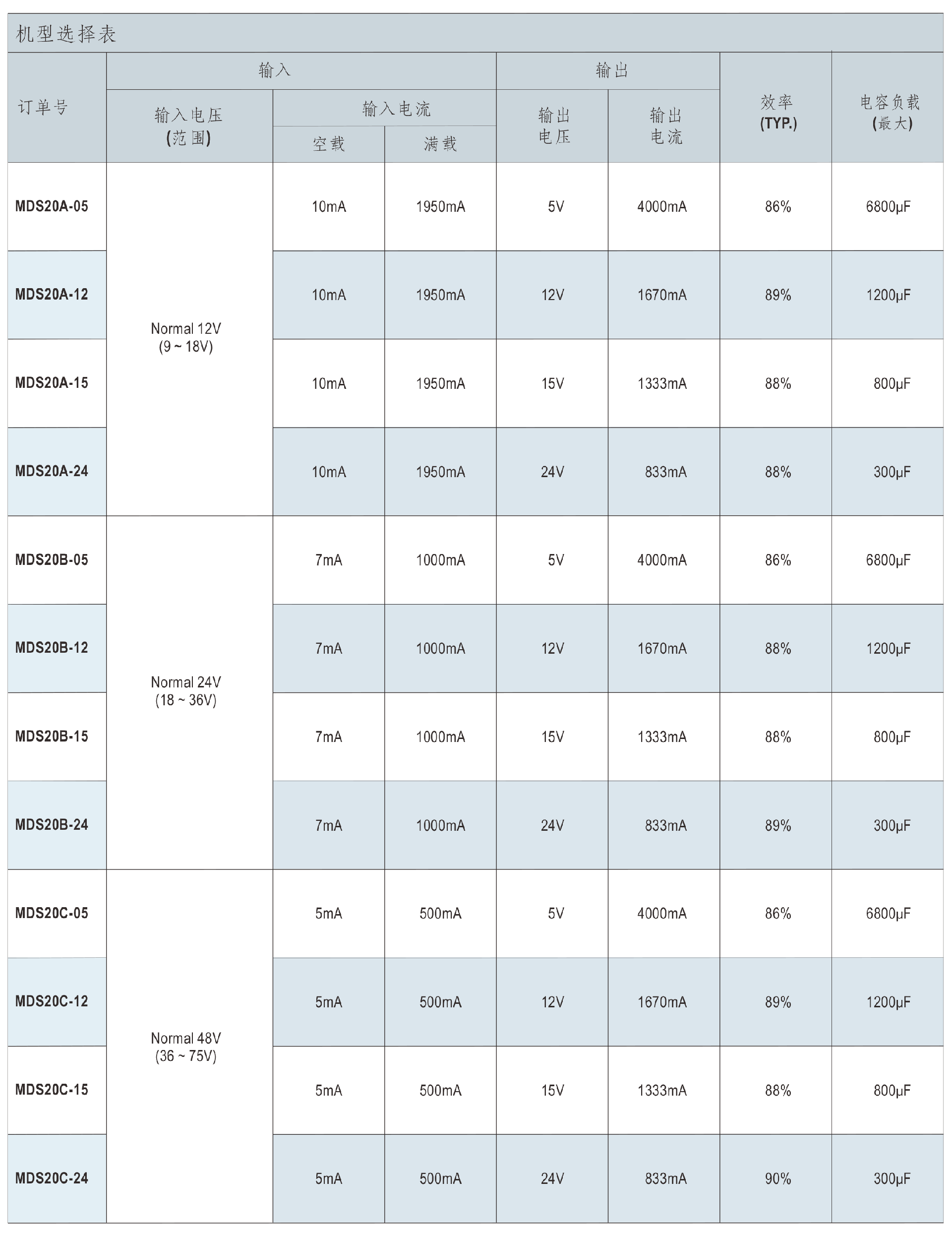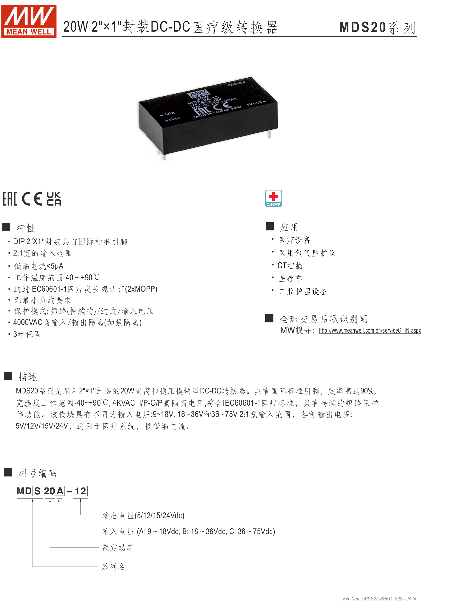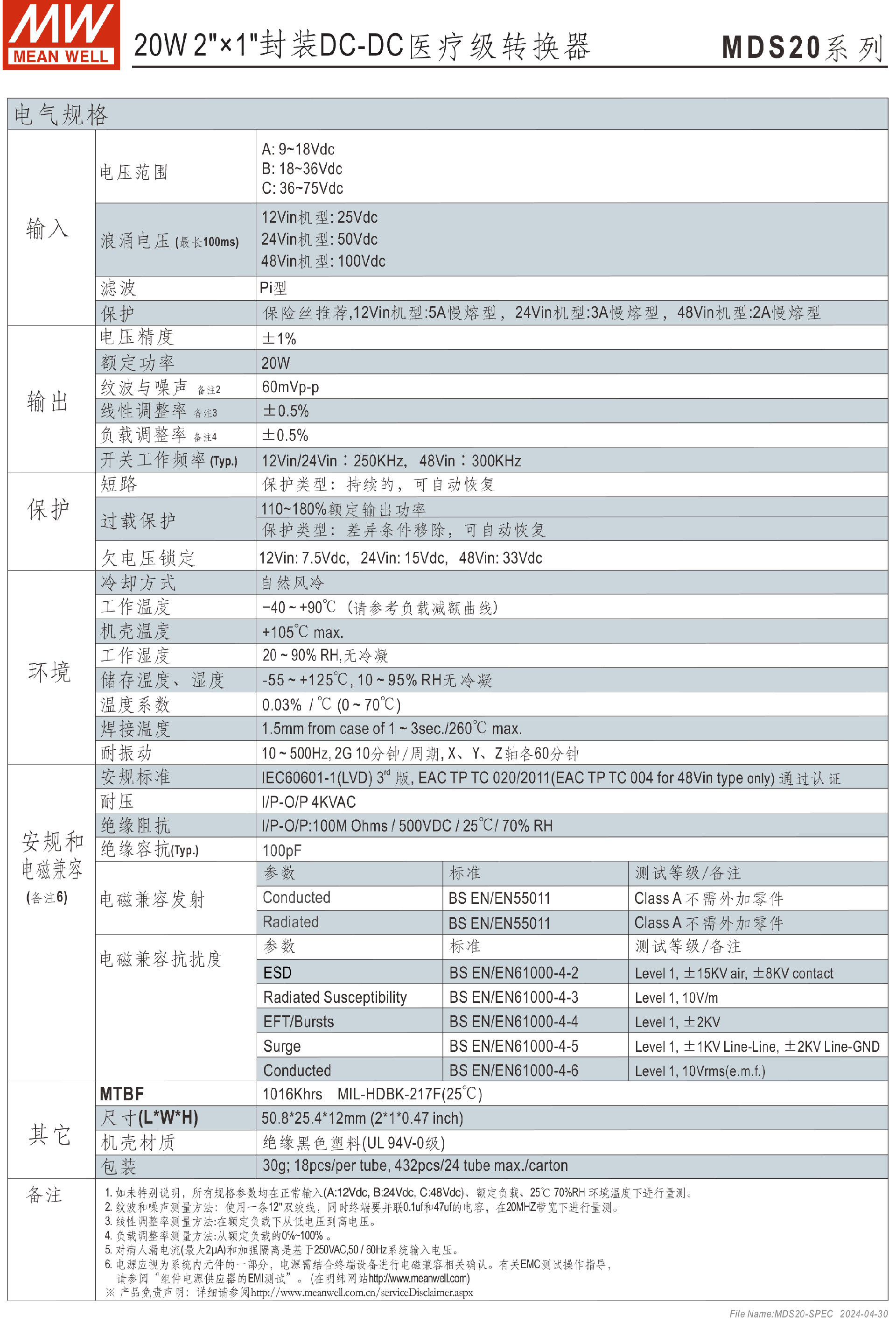 明緯電源MDS20系列20W 封裝DC-DC醫(yī)療級轉換器-MD系列—醫(yī)療型-東莞市誠緯實業(yè)有限公司-