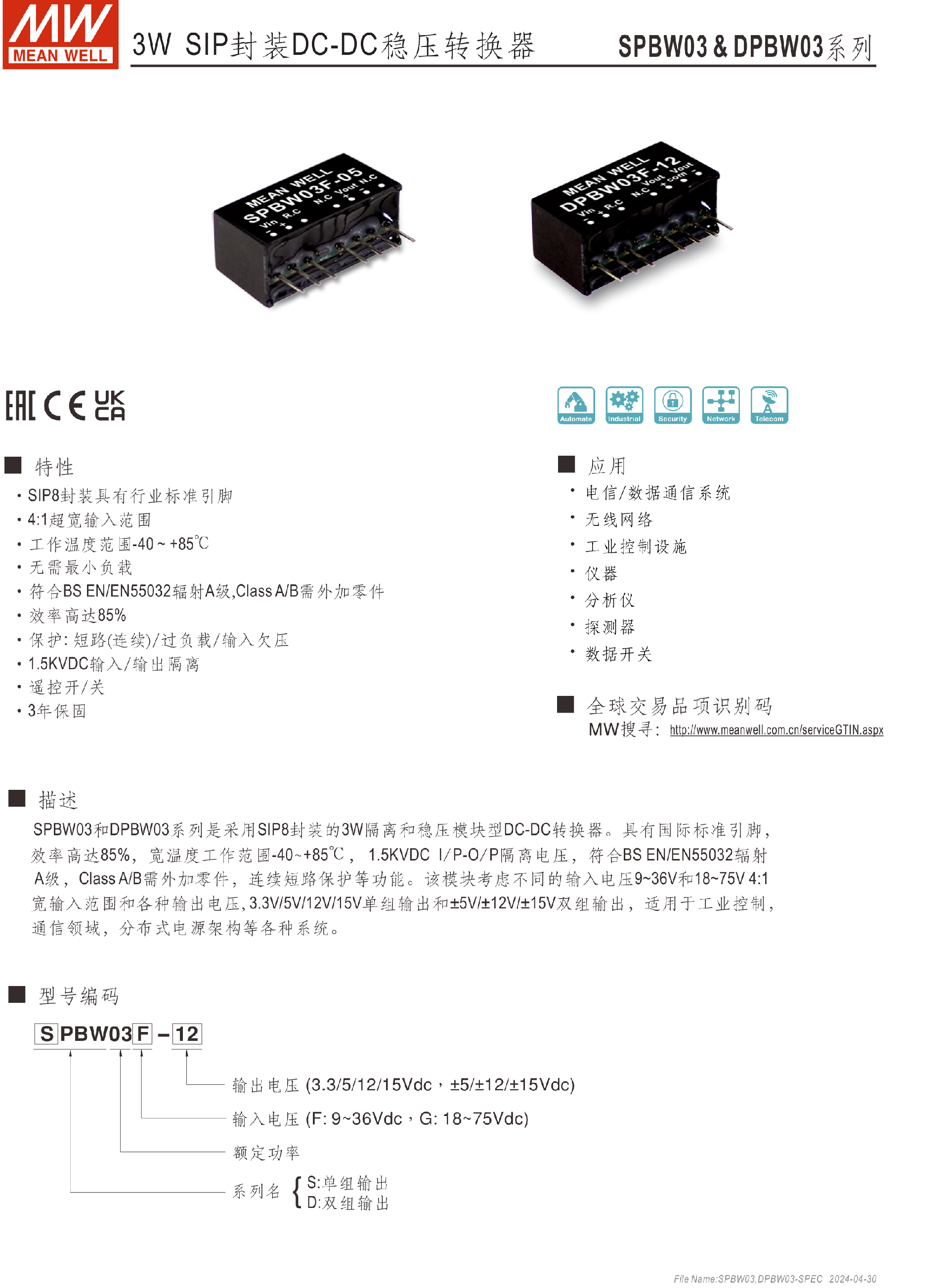 明緯電源SPU03系列3W DC-DC不穩(wěn)壓單組輸出轉(zhuǎn)換器