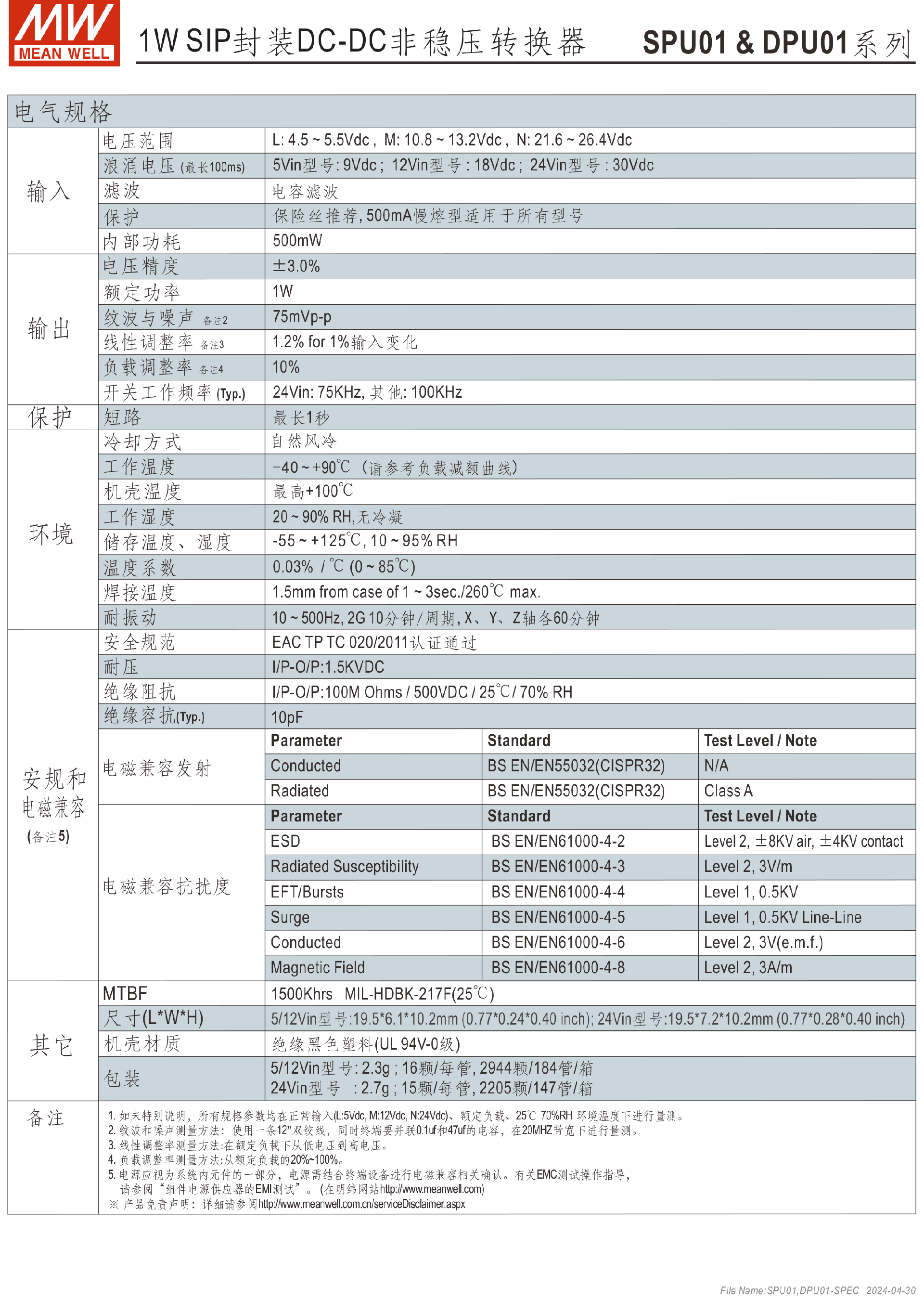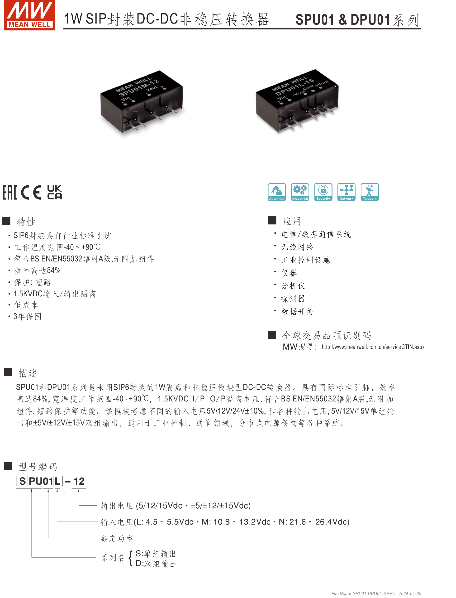 明緯電源SPA01系列1W DC-DC穩(wěn)壓單組輸出變換器