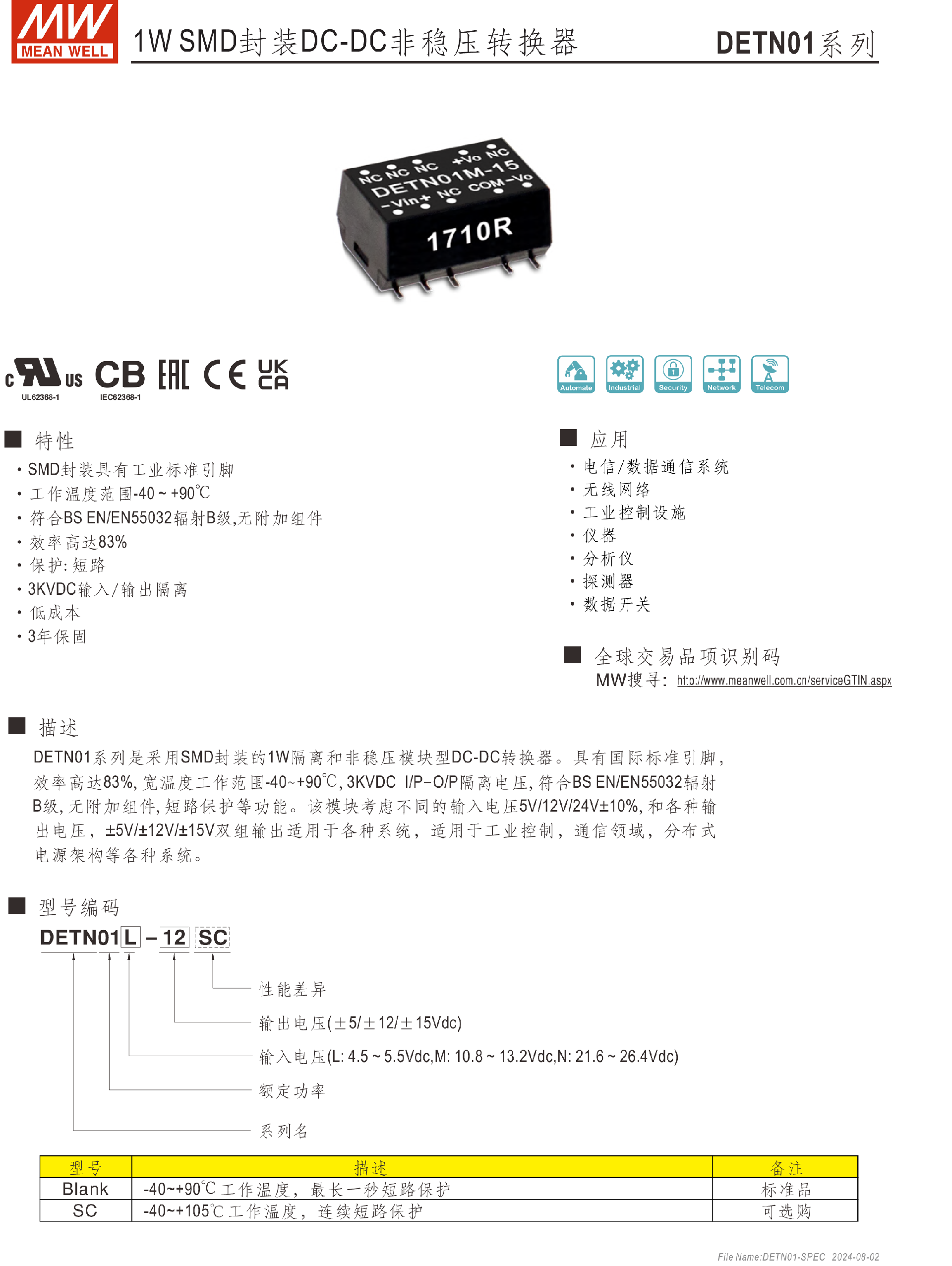 明緯電源DETN02系列2W SMD封裝DC-DC非穩(wěn)壓轉(zhuǎn)換器