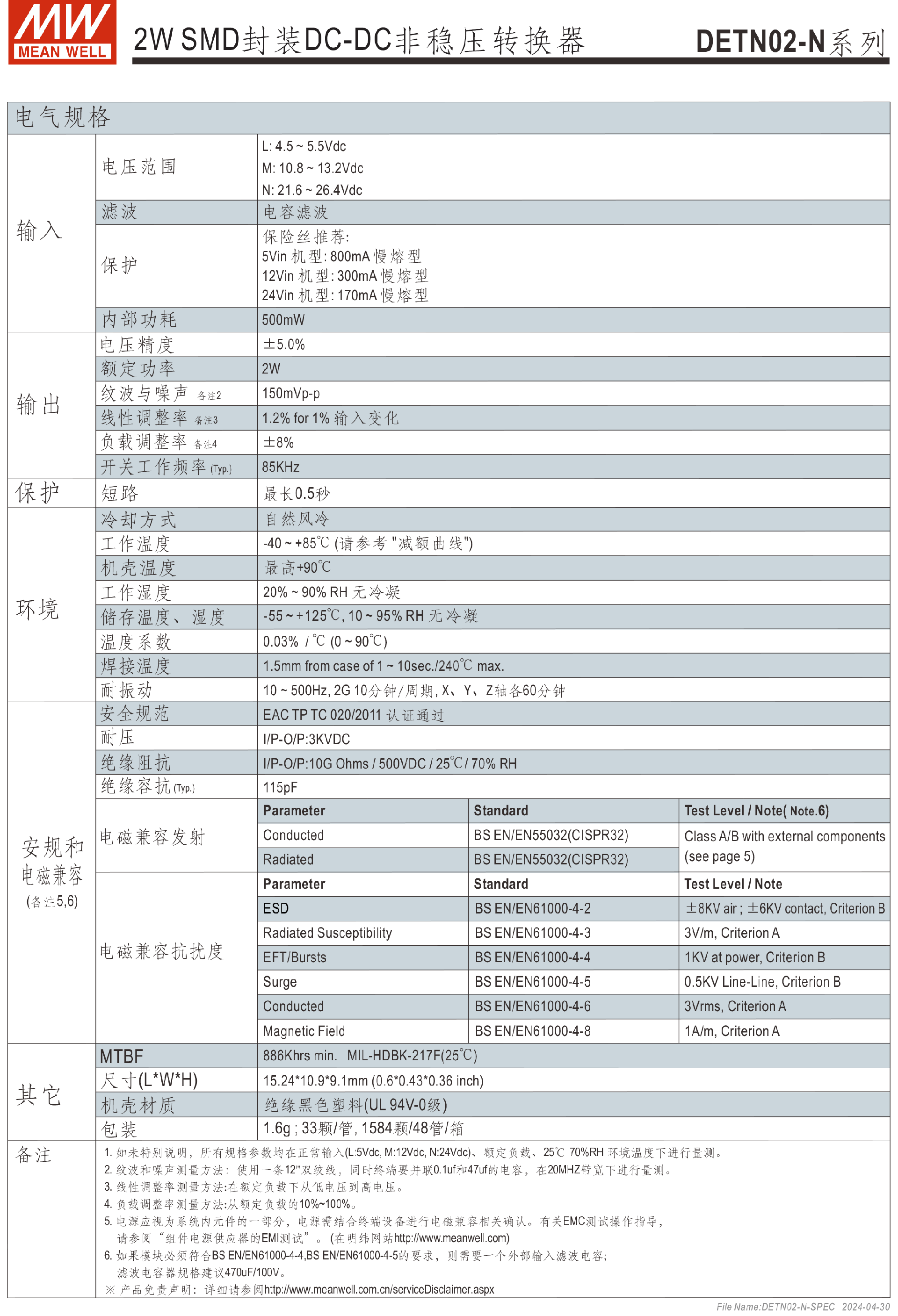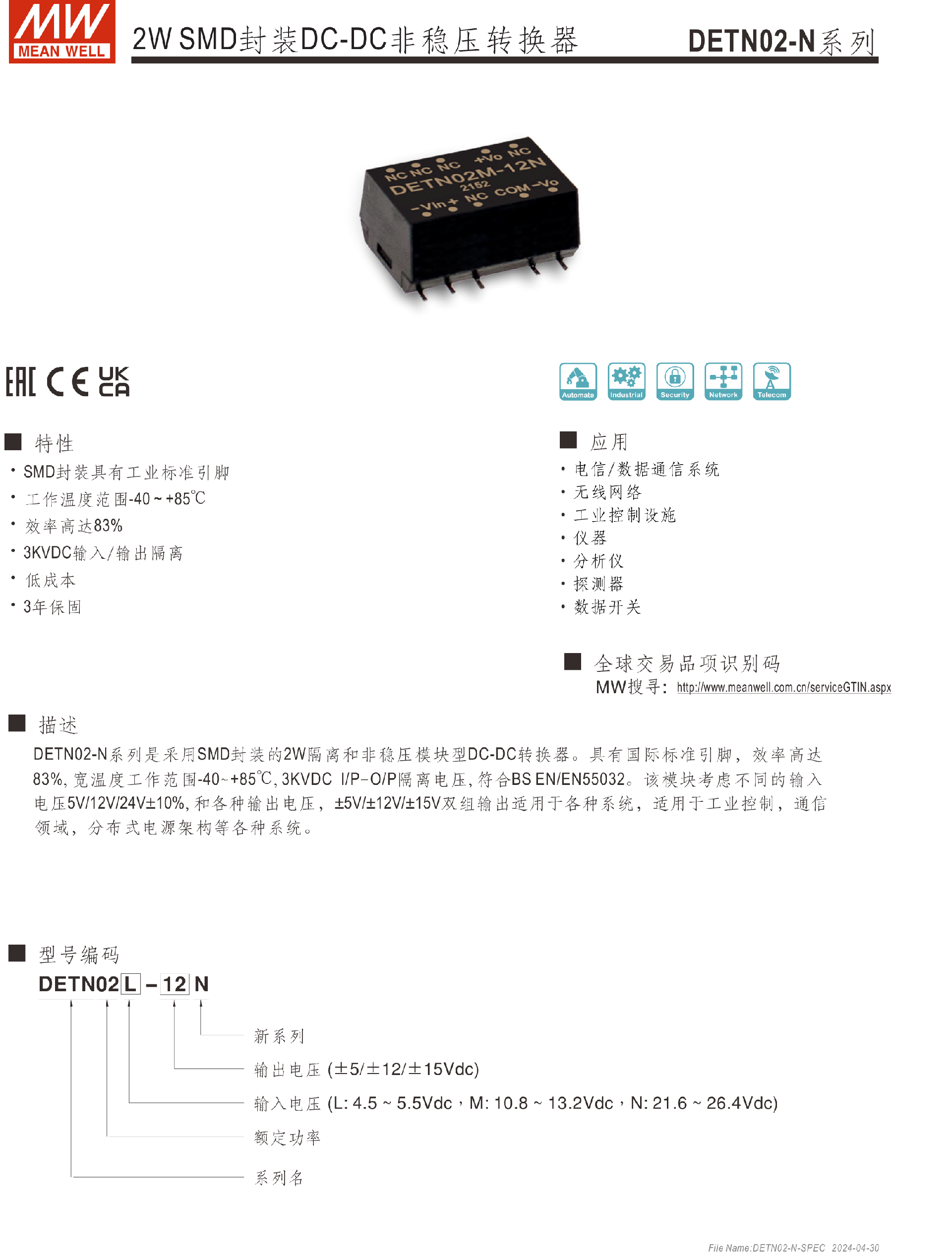 明緯電源DETN02-N系列2W SMD封裝DC-DC非穩(wěn)壓轉換器-SMD系列-東莞市誠緯實業(yè)有限公司-