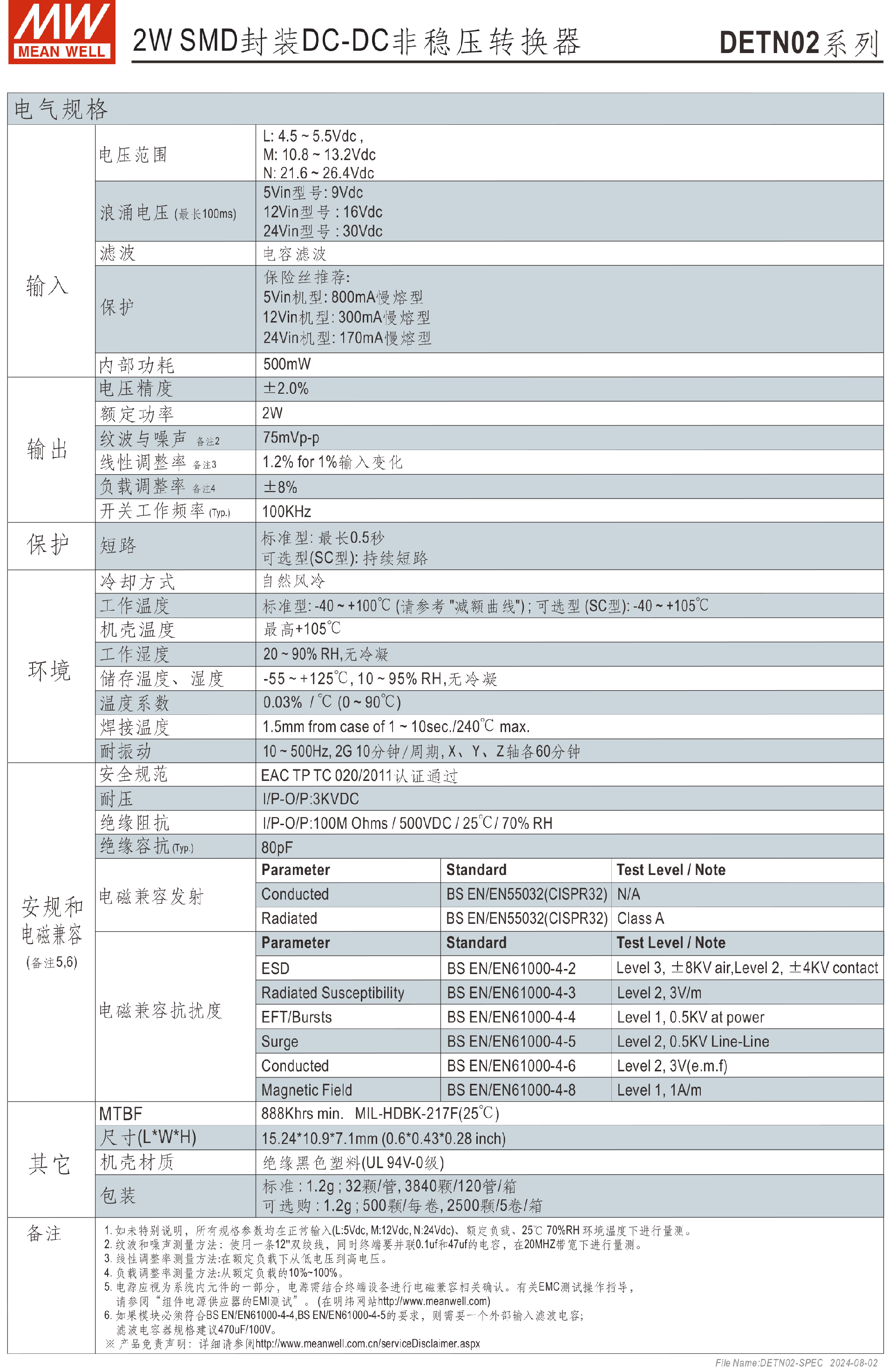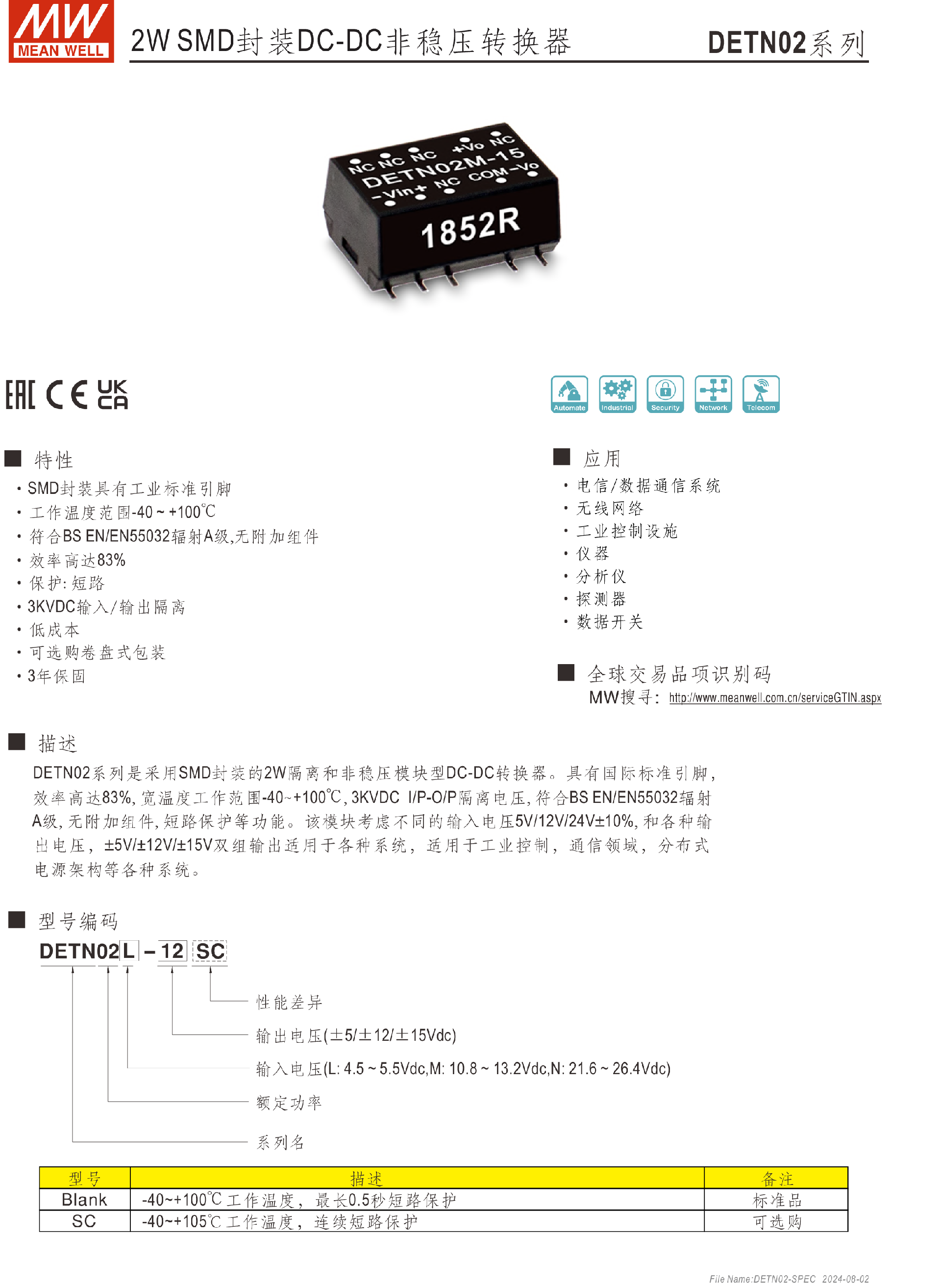 明緯電源DETN02系列2W SMD封裝DC-DC非穩(wěn)壓轉(zhuǎn)換器