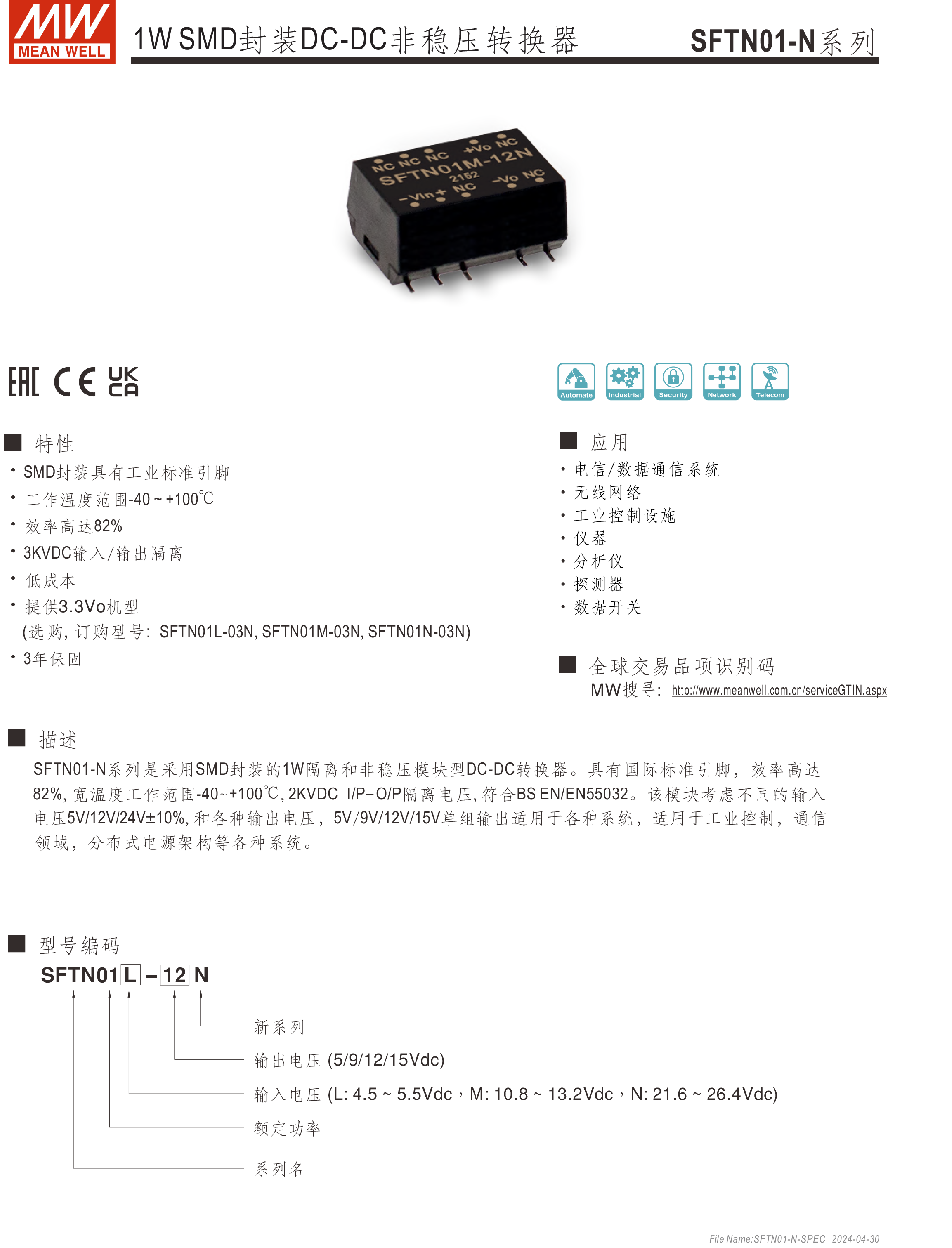 明緯電源SFTN01系列1W SMD封裝DC-DC非穩(wěn)壓轉(zhuǎn)換器