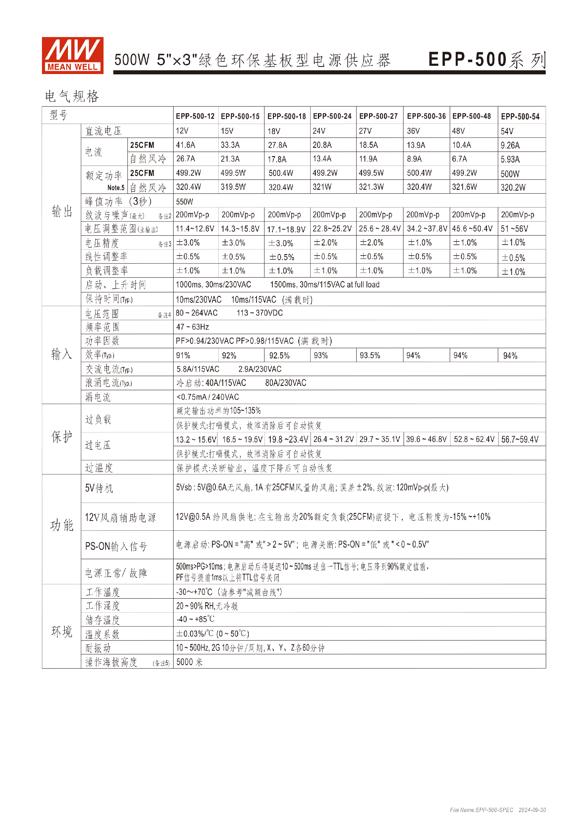 臺灣明緯EPP-500系列500W單組輸出開關(guān)電源