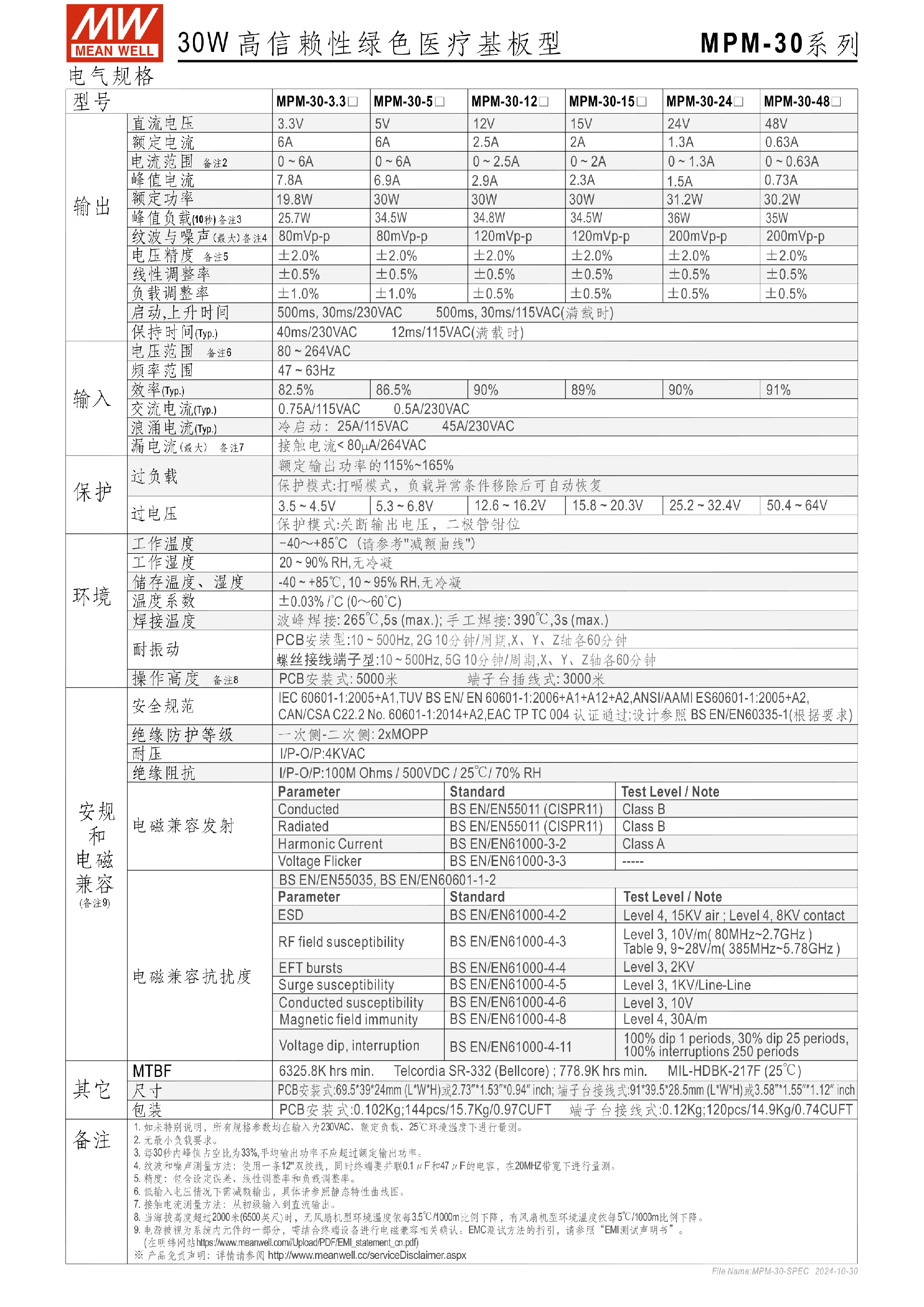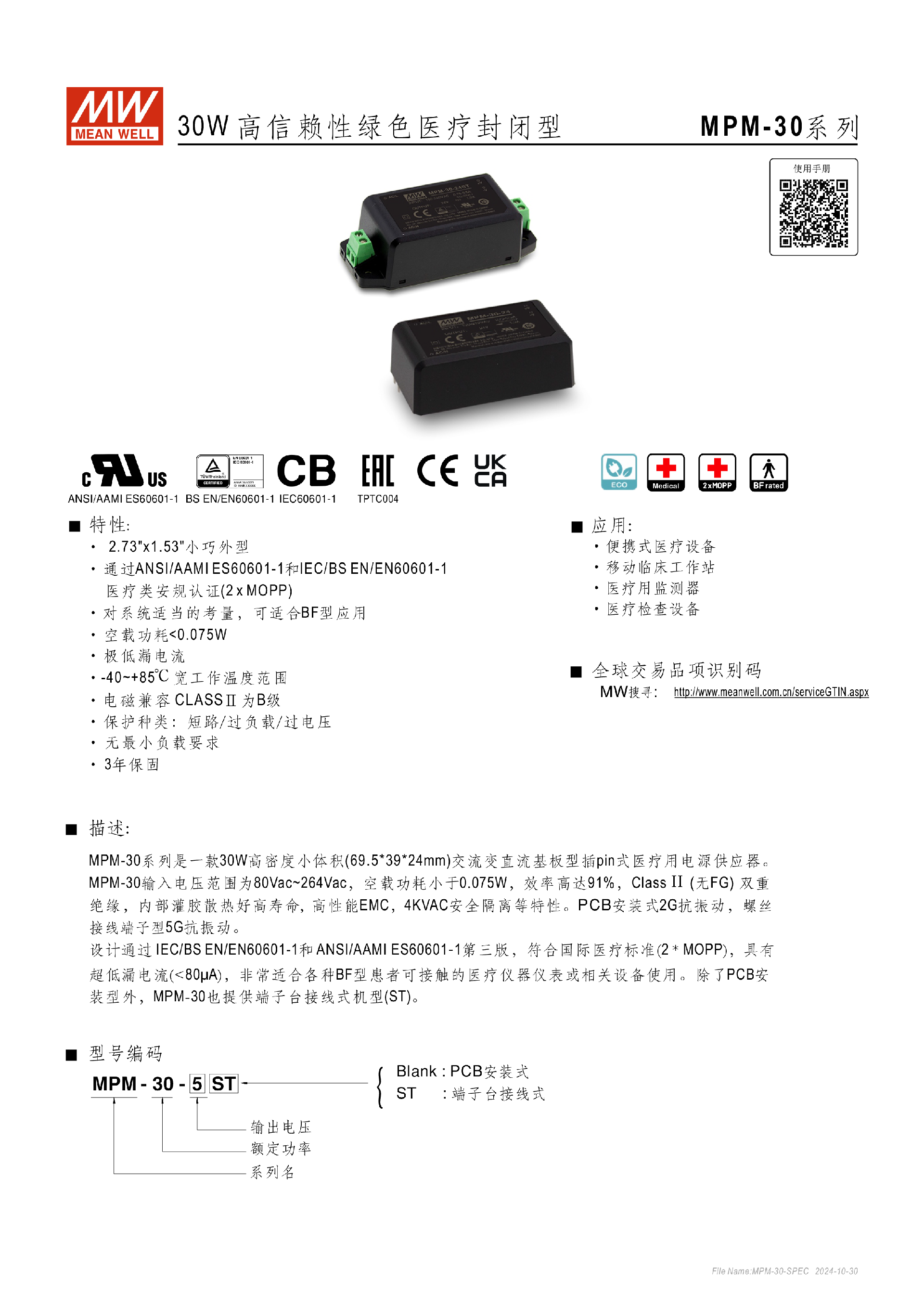 臺(tái)灣明緯MPM-30系列醫(yī)療封閉型電源