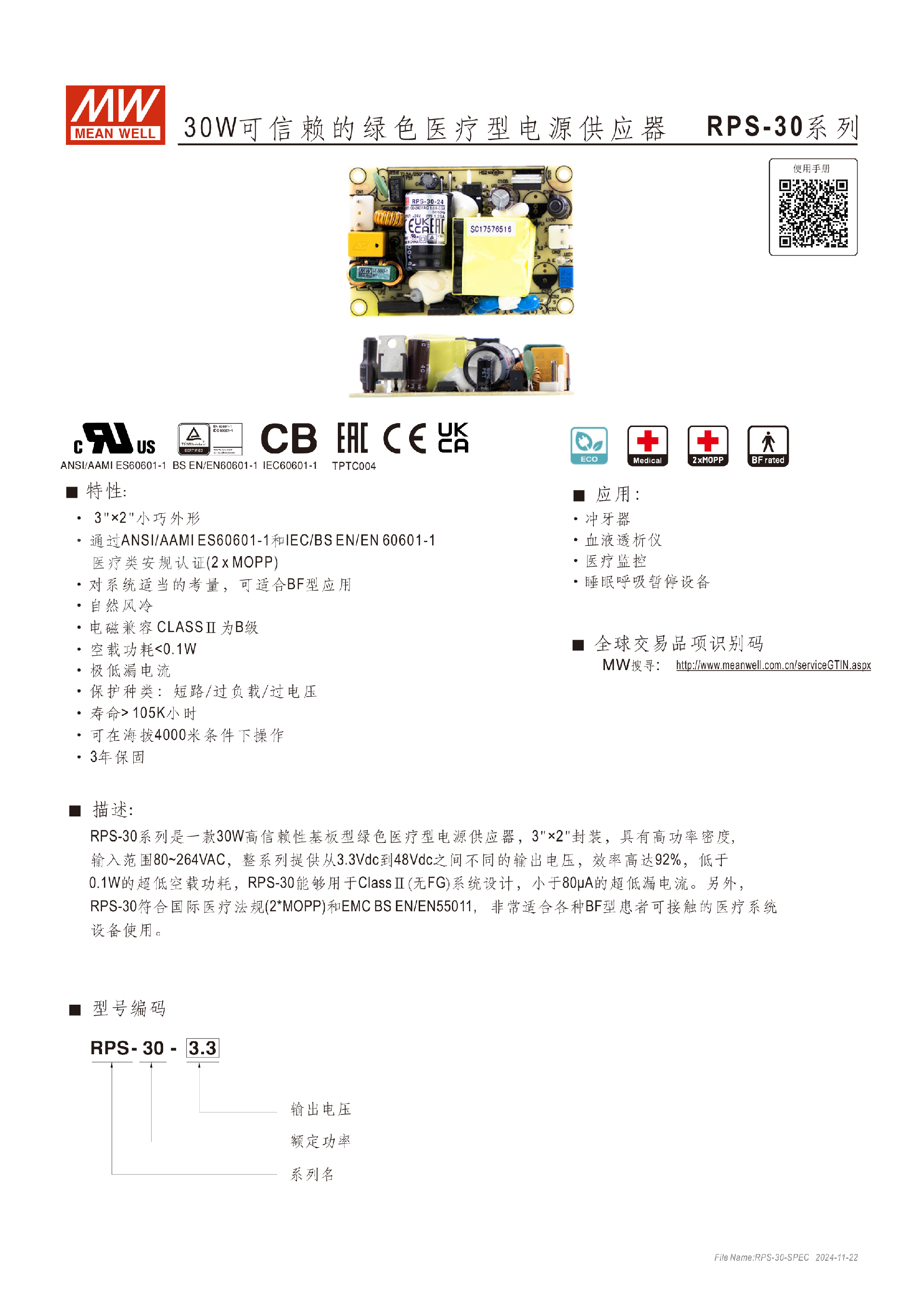 臺(tái)灣明緯MFM-30系列醫(yī)療基板型電源