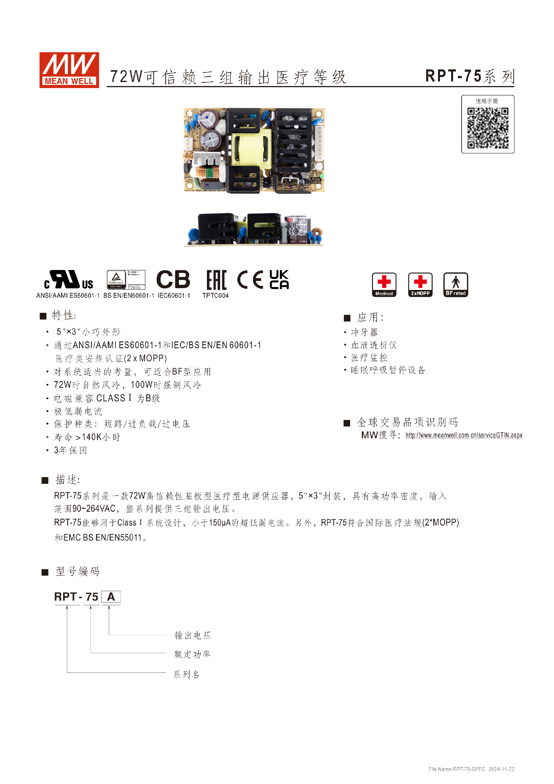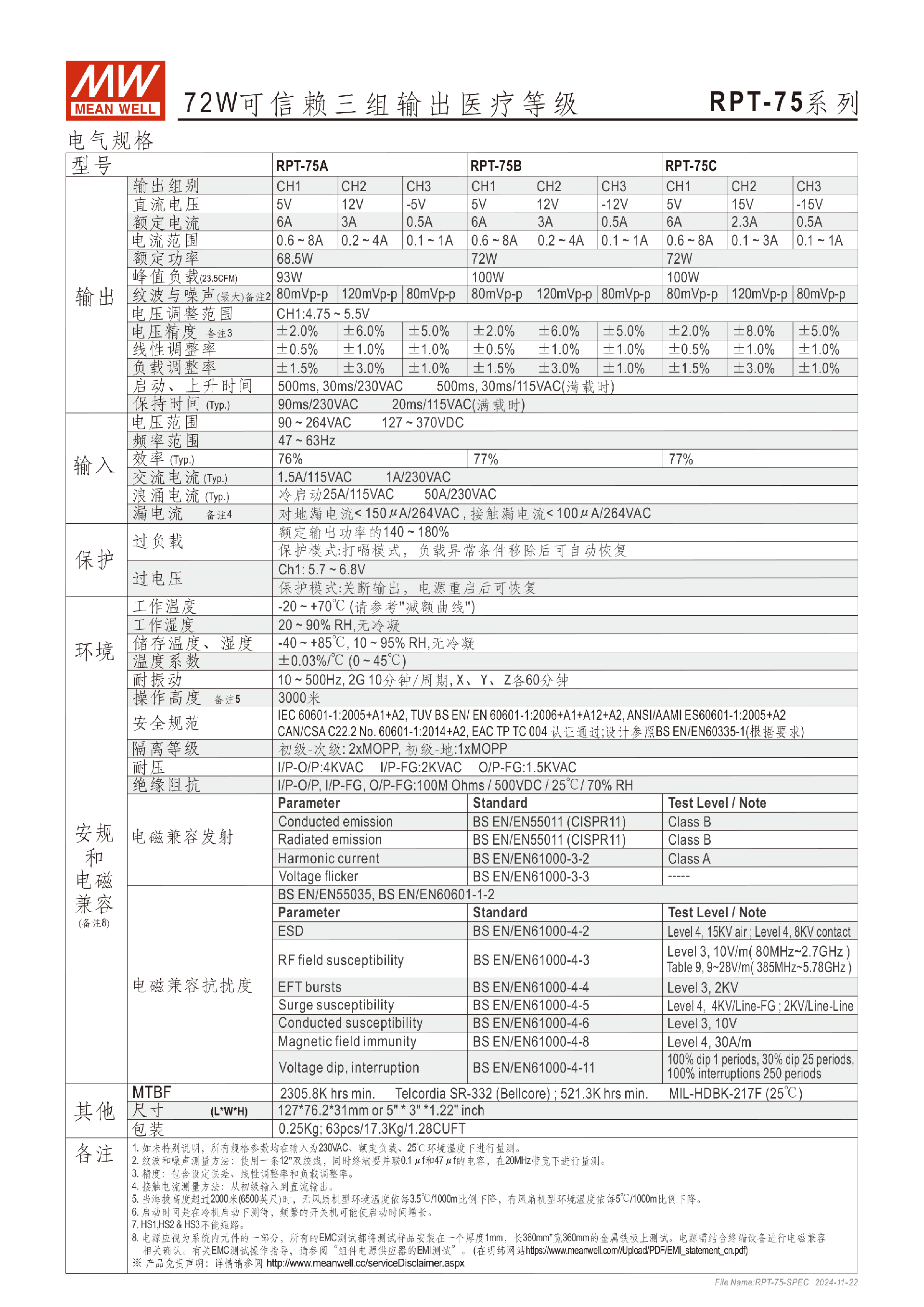 臺灣明緯RPT-75系列三組輸出醫(yī)療電源供應器-醫(yī)療用-東莞市誠緯實業(yè)有限公司-
